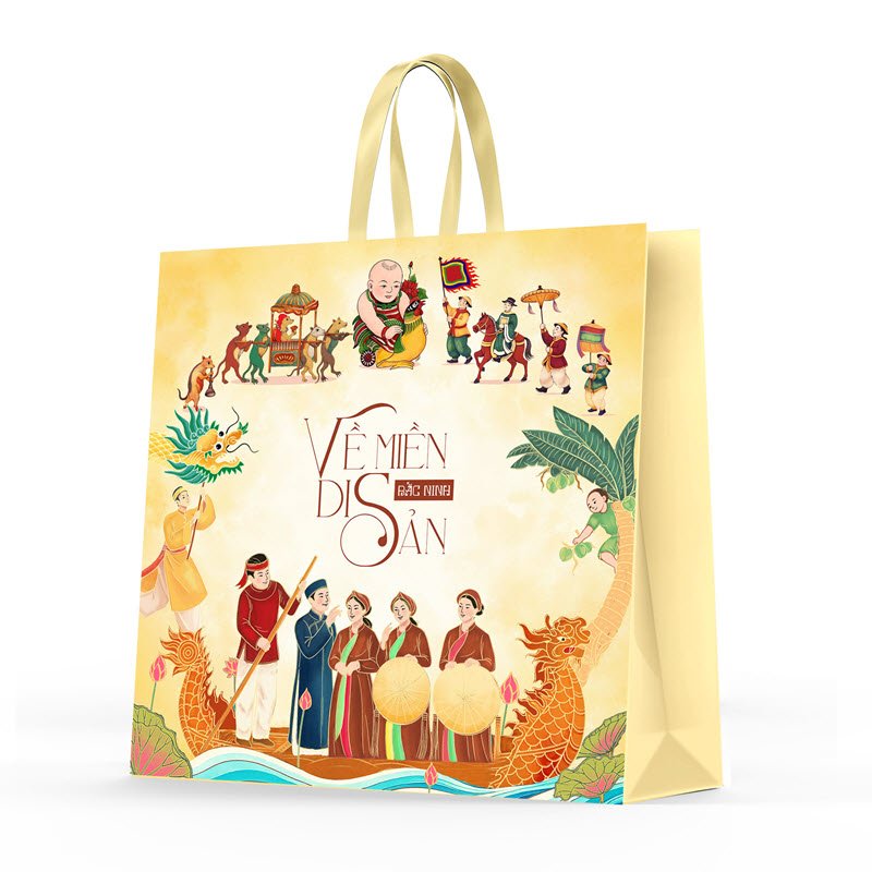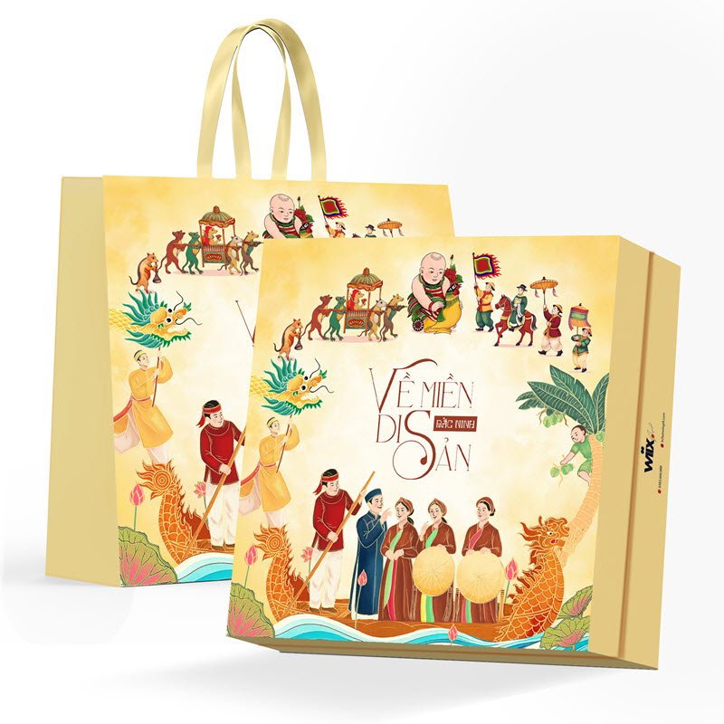 Bộ quà tặng “Về Miền Di Sản” là một bản giao hưởng giữa truyền thống và hiện đại. Điểm độc đáo nhất chính là bao bì được thiết kế như một tác phẩm nghệ thuật, tái hiện sống động những giá trị của vùng đất Bắc Ninh giàu truyền thống. Hộp quà và túi giấy đi kèm là sự hội tụ của các di sản văn hóa phi vật thể đã được UNESCO công nhận: