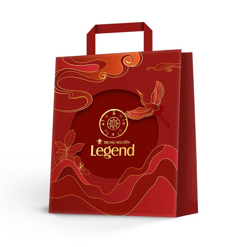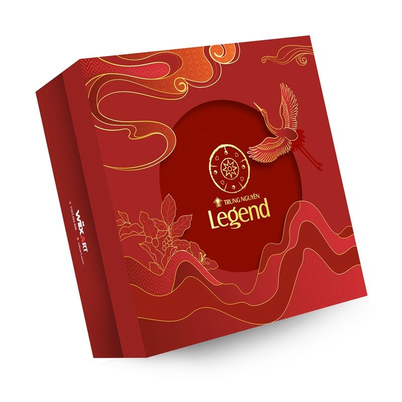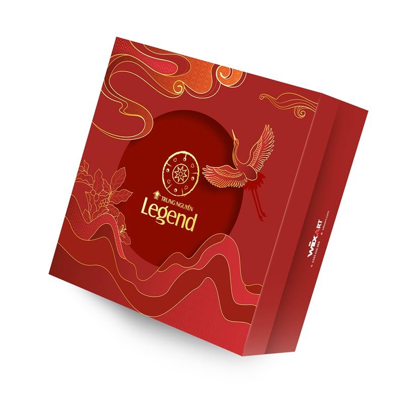 Tất cả hòa quyện tạo nên một bố cục sống động, cân bằng giữa truyền thống và hiện đại. Ở trung tâm hộp quà là logo Trung Nguyên Legend được in ép kim nổi bật, tạo điểm nhấn sang trọng và dễ ghi nhớ.