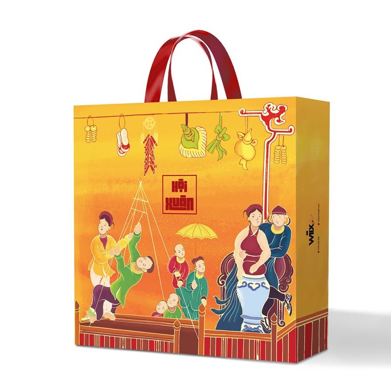 Túi giấy đồng bộ với hộp quà, tiếp tục câu chuyện hình ảnh “Hội Xuân” từ bên ngoài vào bên trong. Sự nhất quán này giúp bộ quà trở thành một tổng thể hoàn chỉnh, từ cái nhìn đầu tiên cho đến trải nghiệm sử dụng.