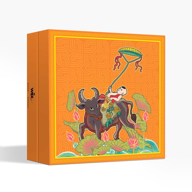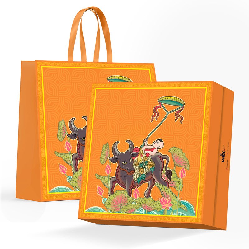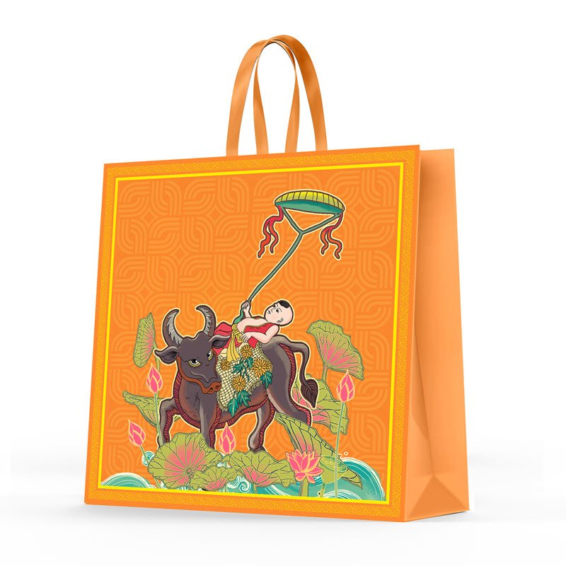 Trong thiết kế hộp quà, tinh thần tạo hình của tranh Đông Hồ được giữ lại, nhưng được xử lý theo ngôn ngữ hiện đại. Gam màu cam ấm làm chủ đạo gợi liên tưởng đến sắc giấy điệp truyền thống, tạo cảm giác gần gũi và thân thiện. Các họa tiết nền mang tính ước lệ được tiết chế vừa đủ, giúp tổng thể không bị nặng tính hoài cổ mà vẫn giữ được sự trang nhã, phù hợp với môi trường doanh nghiệp.